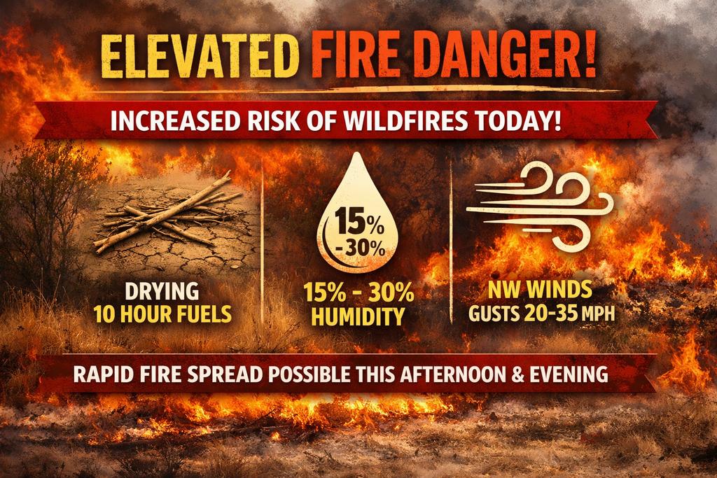 According to the weather advisory, a combination of very dry vegetation, low humidity levels between 15 and 30 percent, and northwesterly wind gusts of 20 to 35 mph is creating conditions that could allow fires to spread rapidly. The greatest risk is expected during the afternoon and early evening hours.